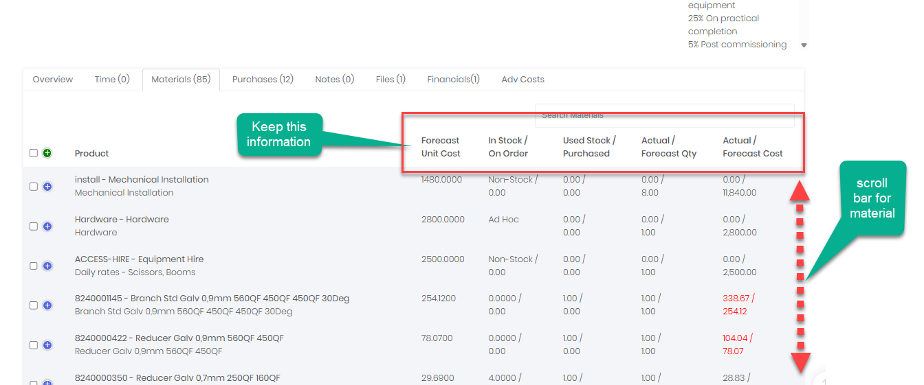 Are you able to put a scroll bar on the material tab in projects keeping the cricitial headers on the
