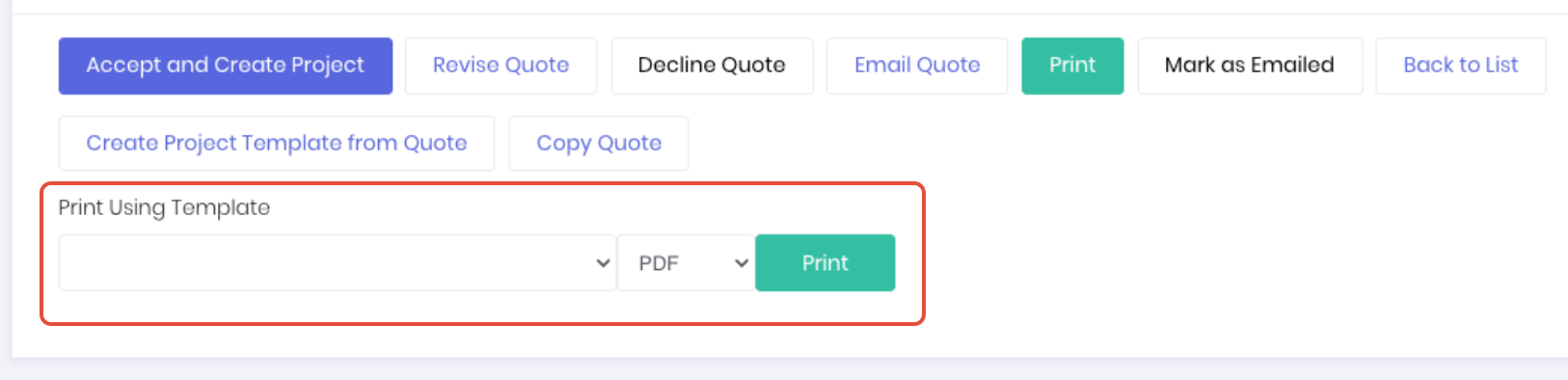 Select the quote template you would like to use from the dropdown and which format you want it in (PDF or Word). Click Print to generate and download the quote.