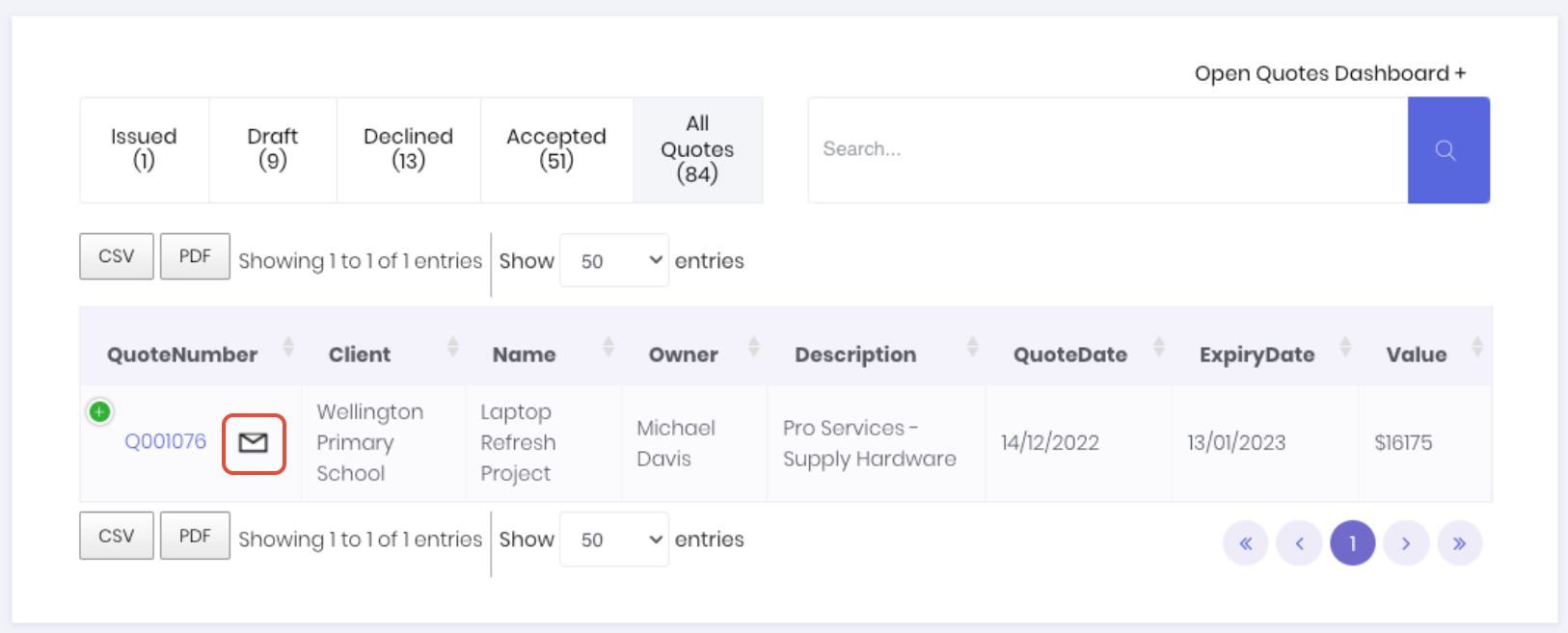 This will display an envelope icon in the quotes dashboard as if it has been emailed directly.