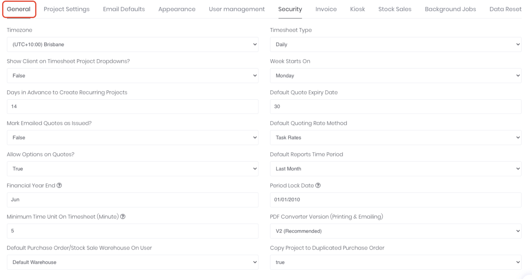 - Financial Year End - Set the last month of your financial year ends if different from June in AU.