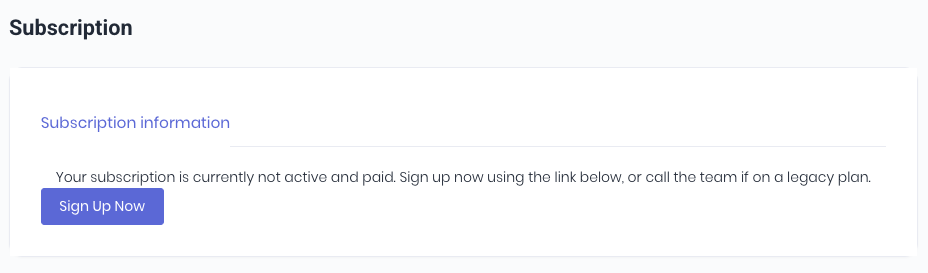 If your active subscription page is displaying the following message, you are on legacy pricing that can't be modified from your end. Contact us at support@workguru.io and the team will be able to update your subscription or upgrade your account to the new billing system.