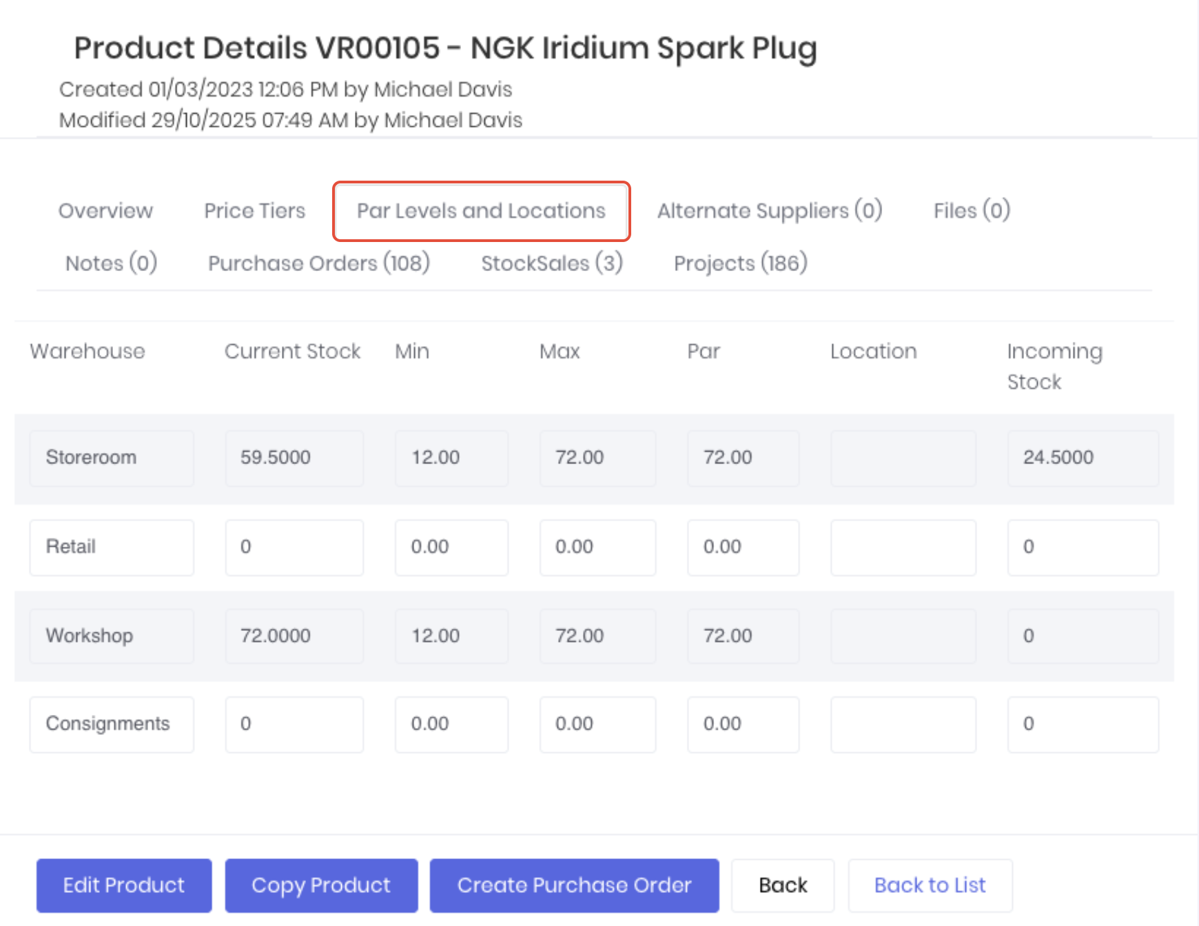 The import will populate the product's Par Levels and Locations tab in the product details. You can then use the buying Guru purchasing automation tool to raise purchase orders automatically using the product Min, Max and Par levels compared to the current stock on hand.