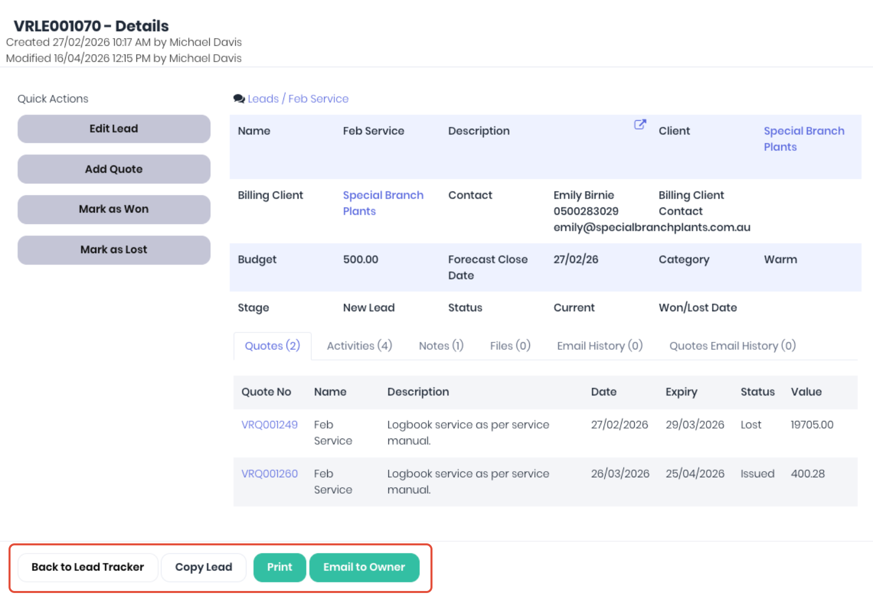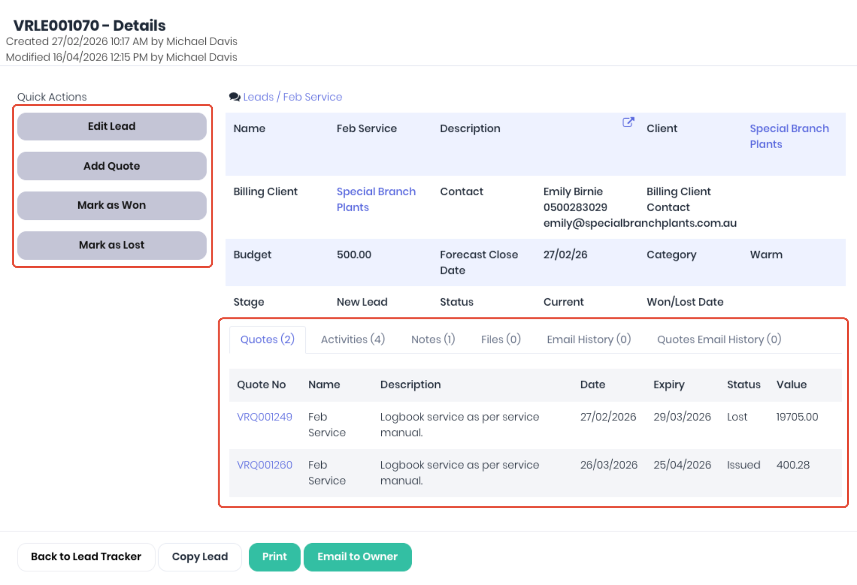 - Quote Email History - If you have emailed any of the quotes managed by the lead directly to the client, these will be logged here.
