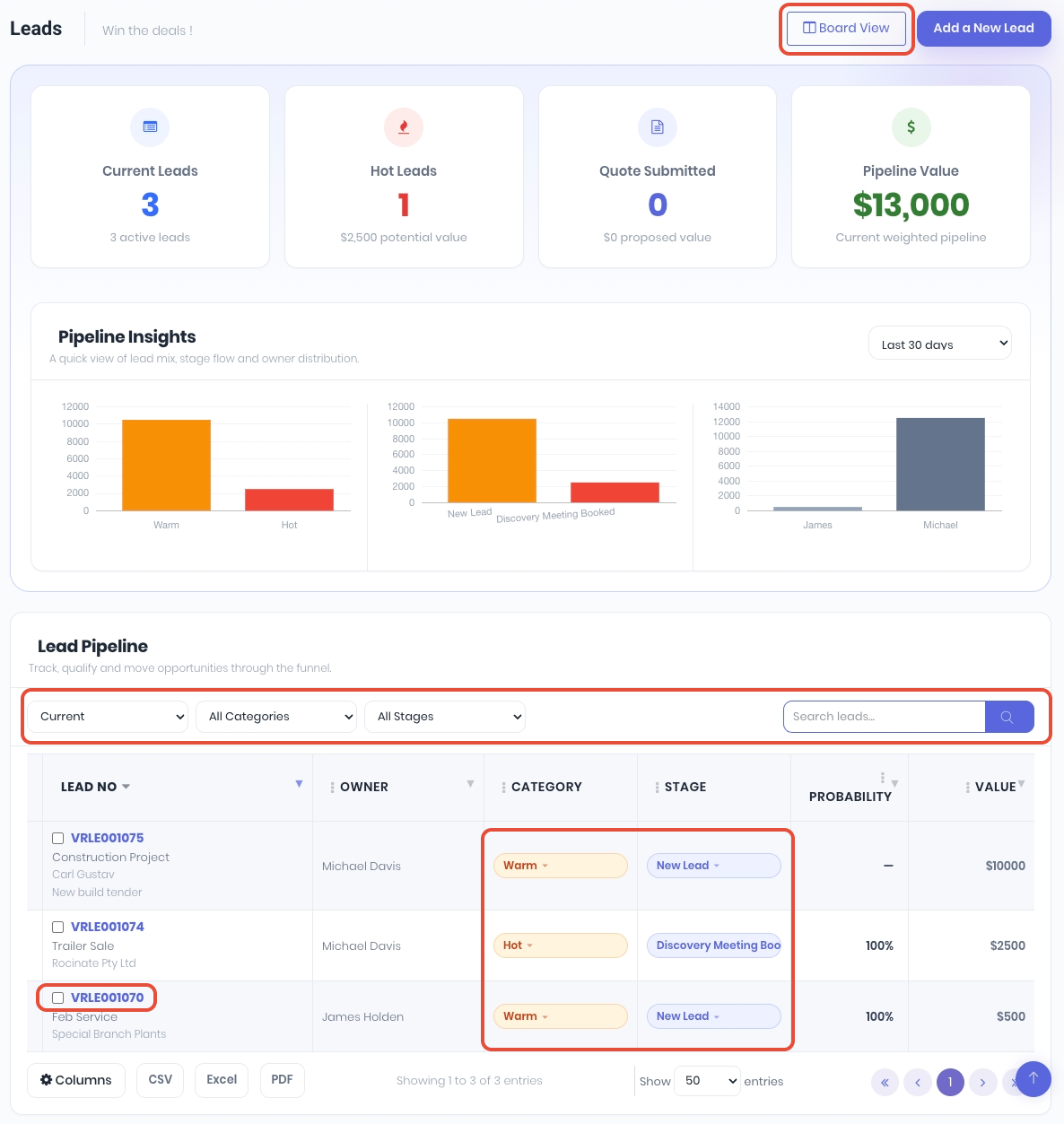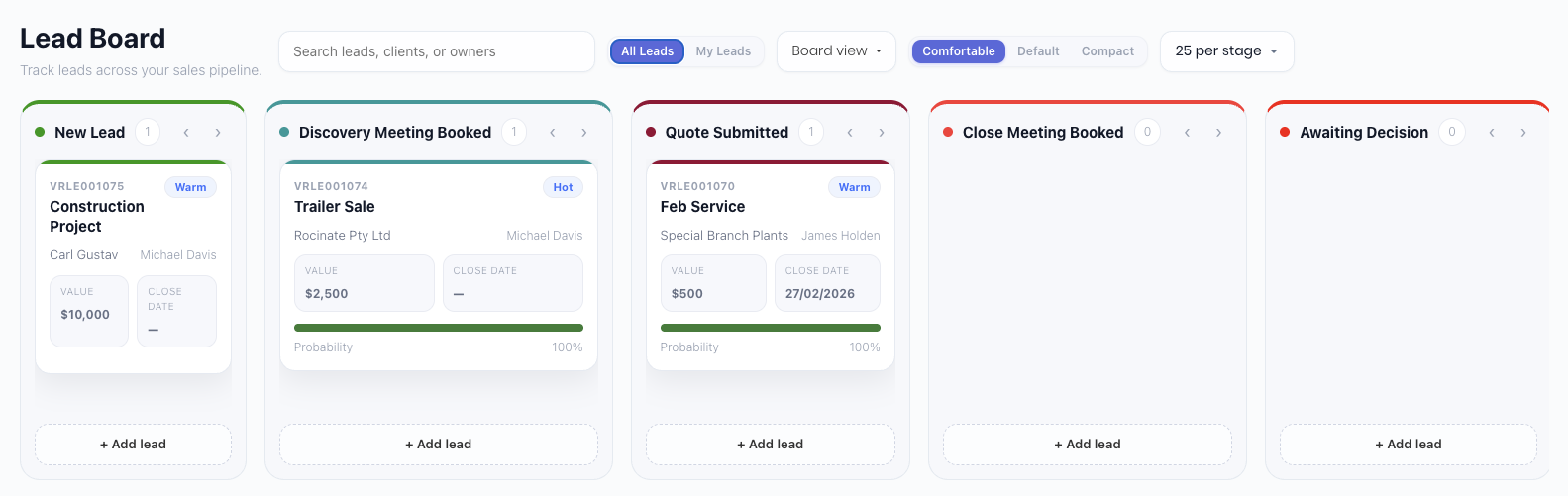 Leads can also be viewed and moved through your stages in a Kanban view by clicking Board View. Drag and drop your leads between stages to update.