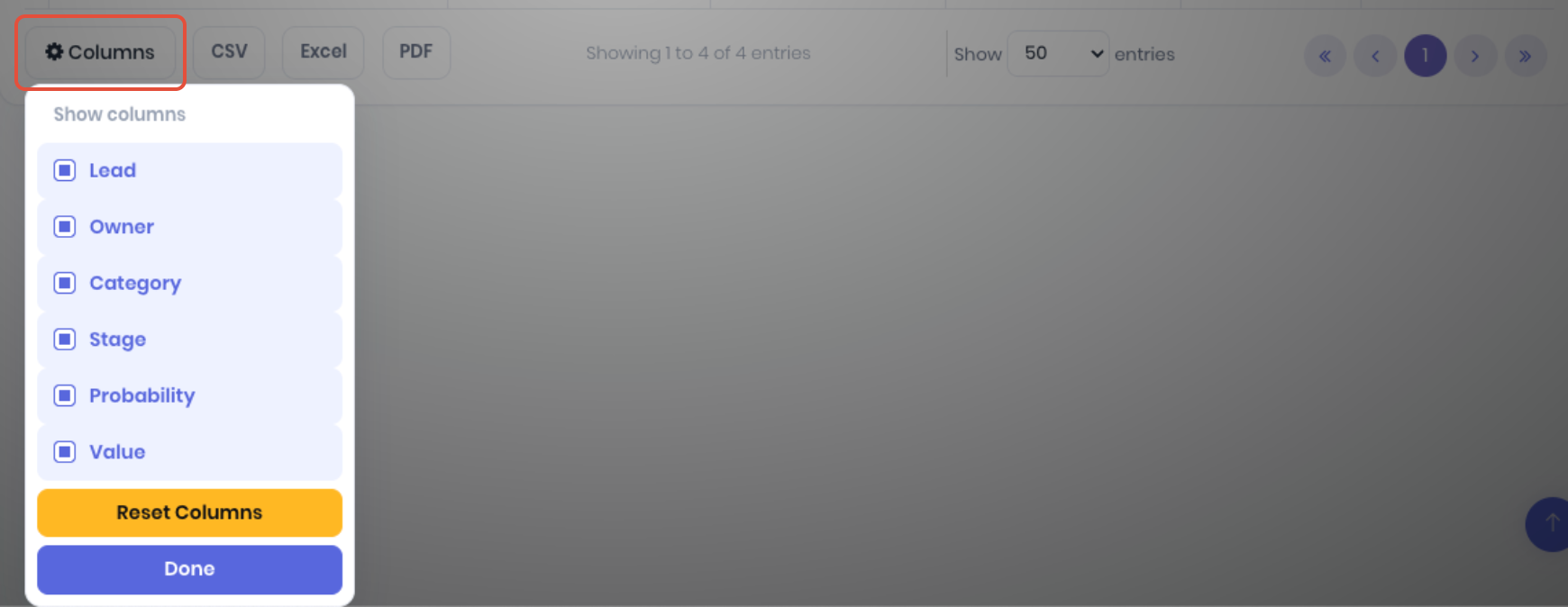 You can customise the Lead Pipeline by clicking on the Columns button in the footer to show or hide columns as required. Select the required columns and click Done to apply. Reset Columns resets the client list back to defaults. Clicking off the popup menu will cancel.