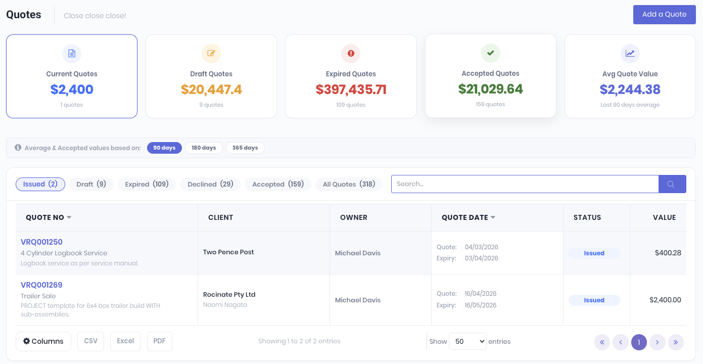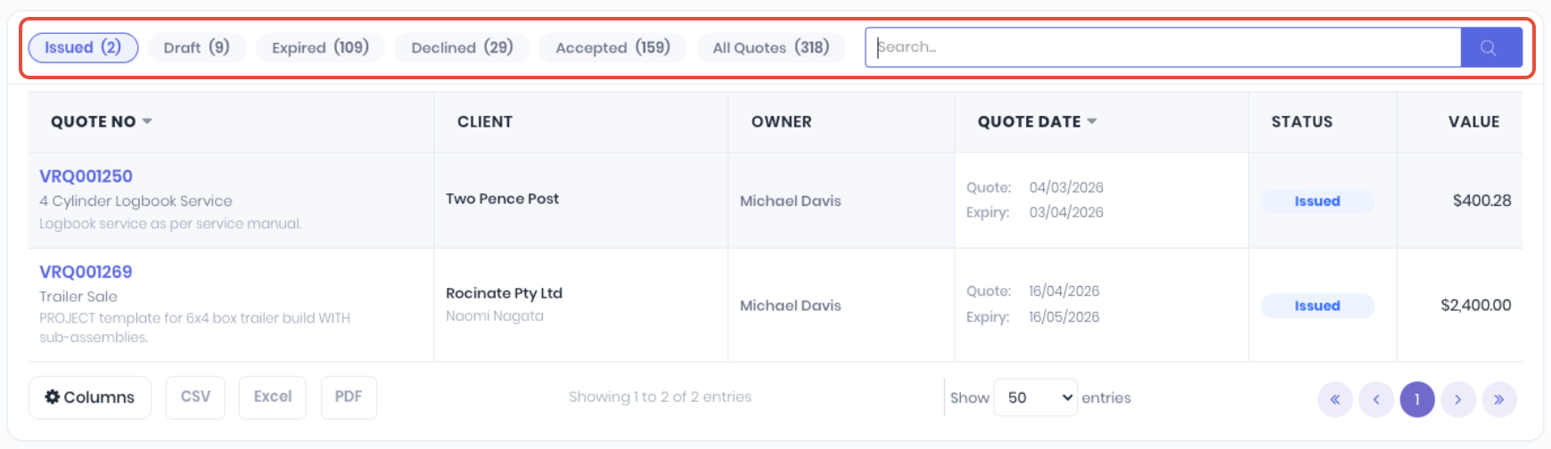 You can arrange the quote list by clicking on the Issued, Draft, Expired, Declined, Accepted or All Quotes tabs, or searching by quote number, name, client, description or owner.