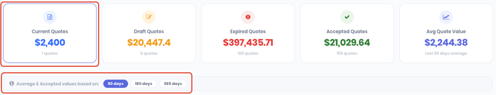The quotes dashboard displays your current sales pipeline by Current Quotes, Draft Quotes, Expired Quotes, Accepted Quotes and Average Quote Value. You can click on each widget to display that subset of quotes. You can select the timeframe the widgets are displaying data by selecting 90 days, 180 days or 365 days.