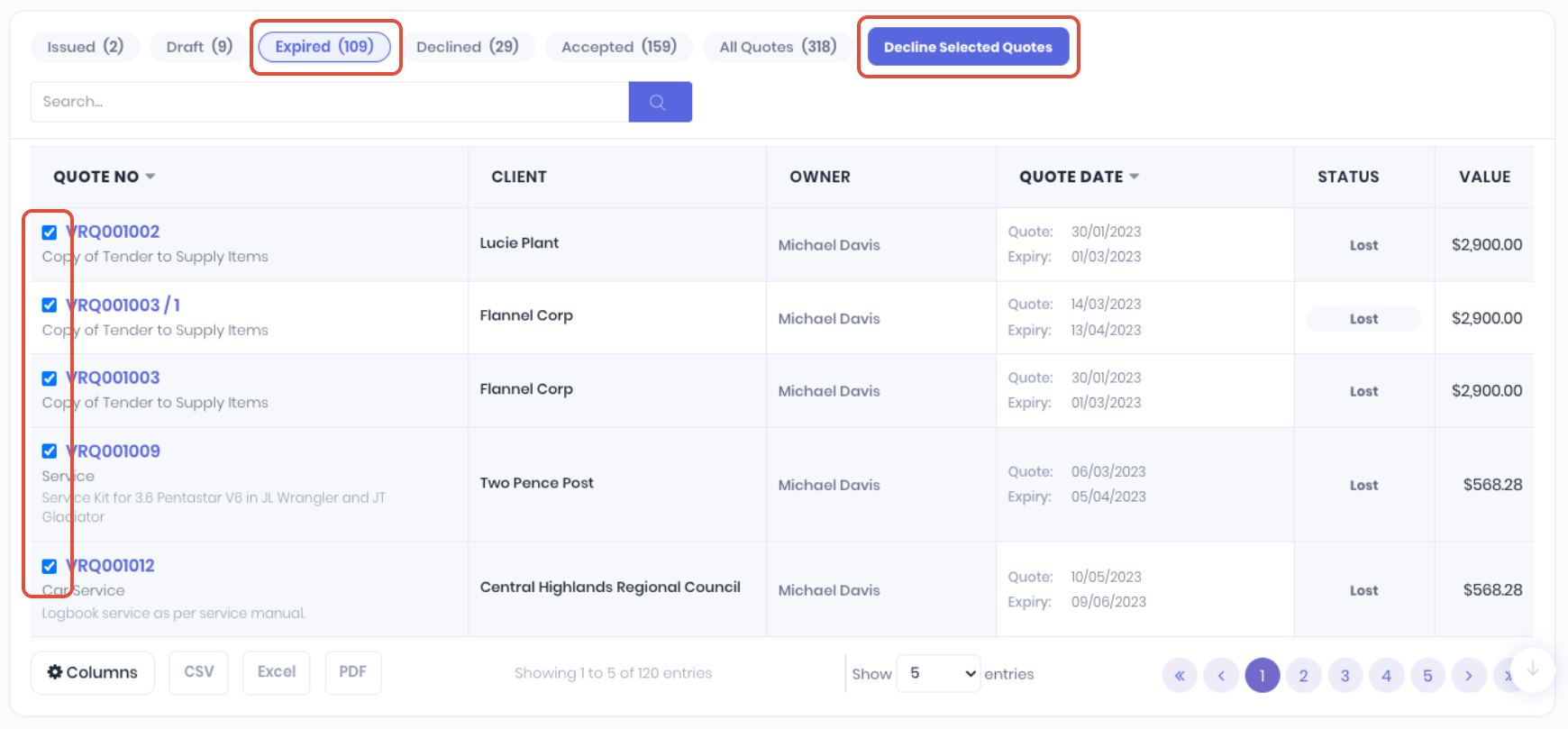 When the Expired tab is selected, you can use the checkboxes to select multiple or all expired quotes in bulk and then click Decline Selected Quotes.