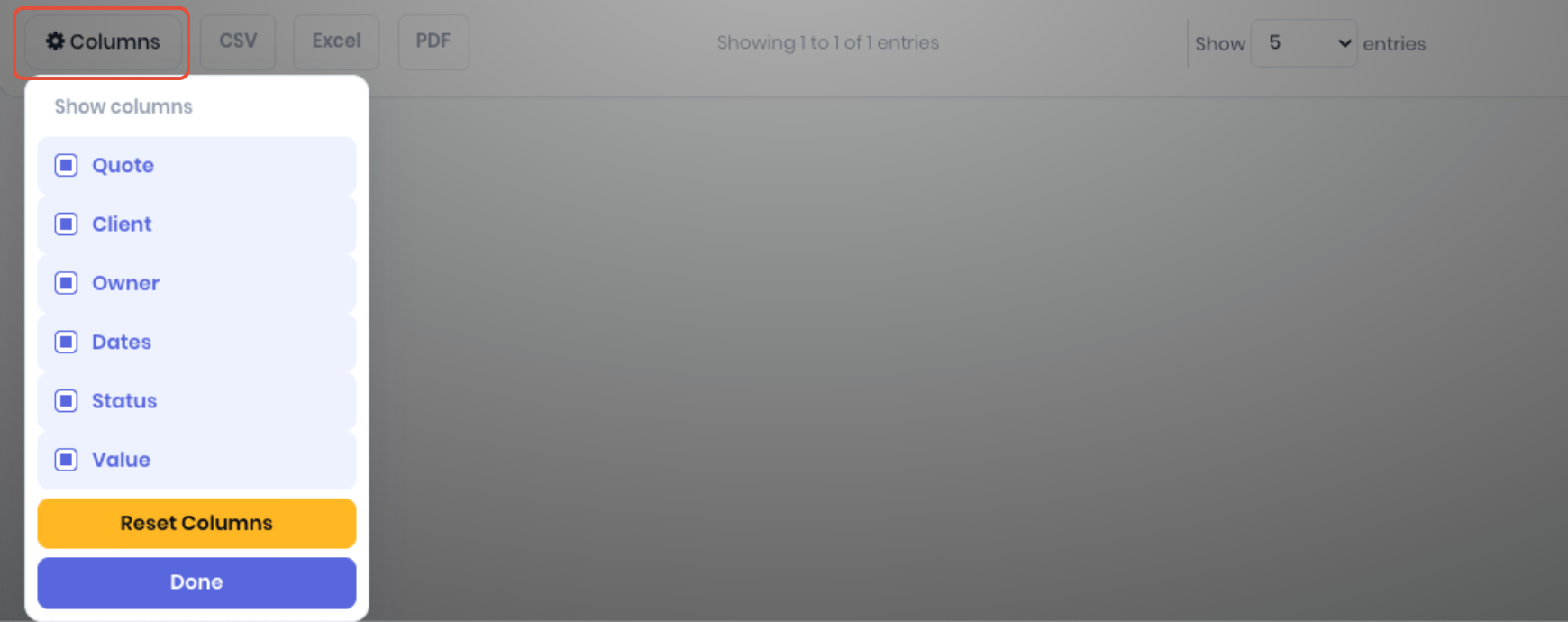 You can customise the quote list by clicking on the Columns button in the footer to show or hide columns as required. Select the required columns and click Done to apply. Reset Columns resets the client list back to defaults. Clicking off the popup menu will cancel.
