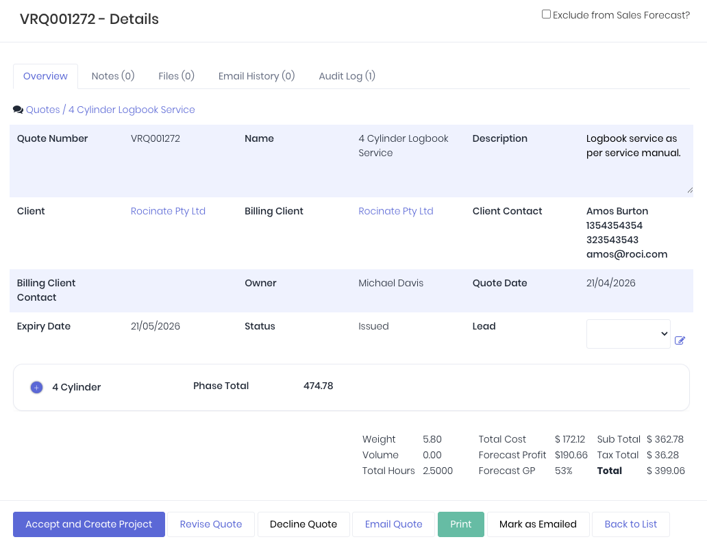 You can open the quote details by clicking the Quote No from the quotes dashboard. The quote details page displays the quote information, line items and forecast financials in the overview tab. You can record notes, upload files and review the email history.