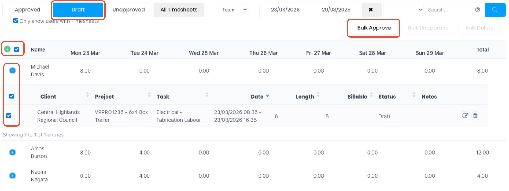 From the timesheet dashboard, the timesheet manager can then approve timesheets in the Draft tab. The list displays to the latest timesheets, using the Date range and the Search field, you can filter timesheets by user, task, client, project, project manager or timesheet note.  You can expand all users to review and approve all timesheets by selecting the green plus "+" icon at the start of the timesheet table header.  To review and approve a users's individual timesheets, expand the row by clicking the blue plus "+" icon at the start of the user's row.  You can approve all or multiple timesheets by selecting the relevant check boxes and clicking Bulk Approve.
