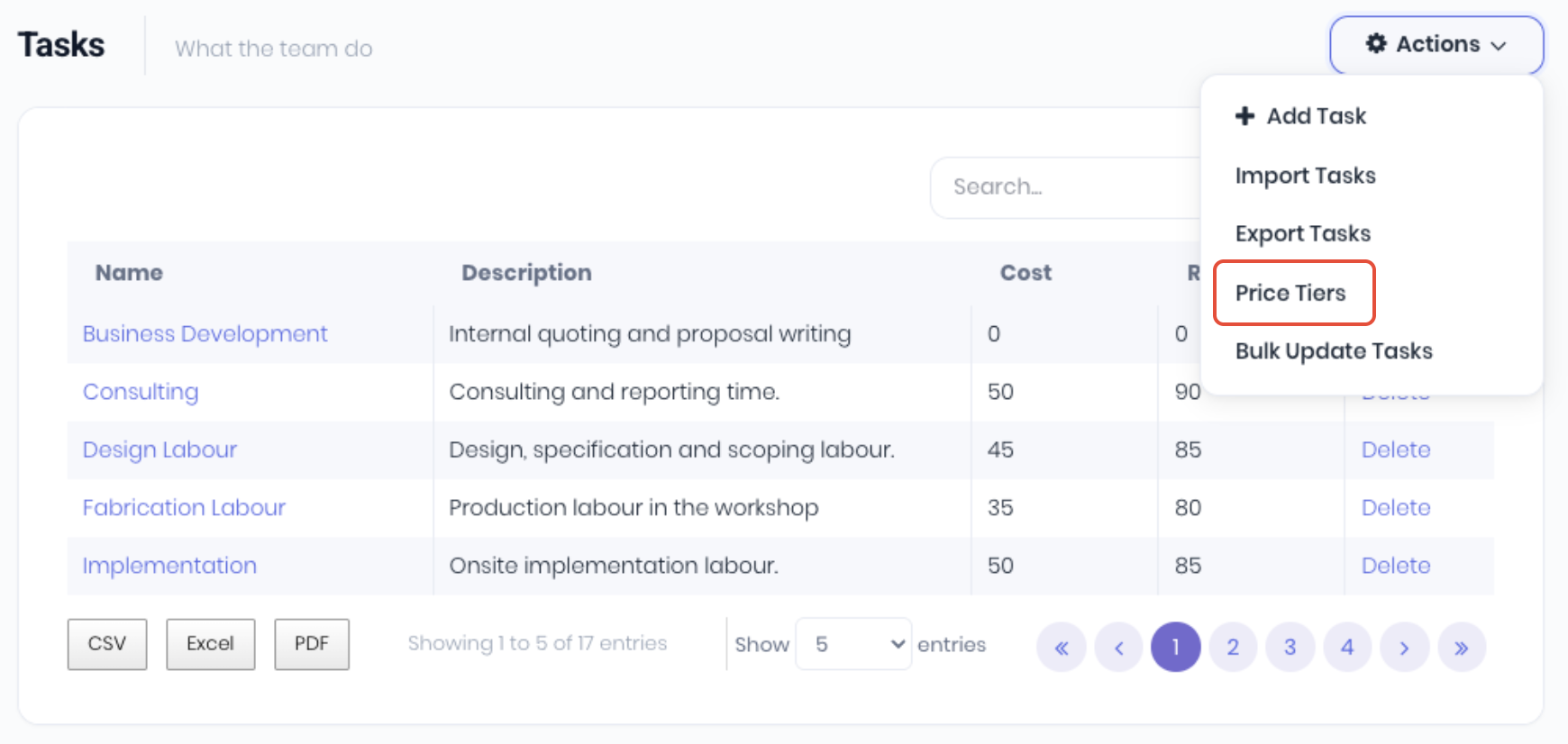 You can review current price tiers by clicking Price Tiers from the task dashboard Actions button.