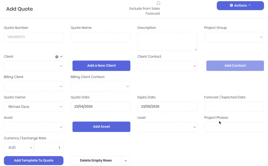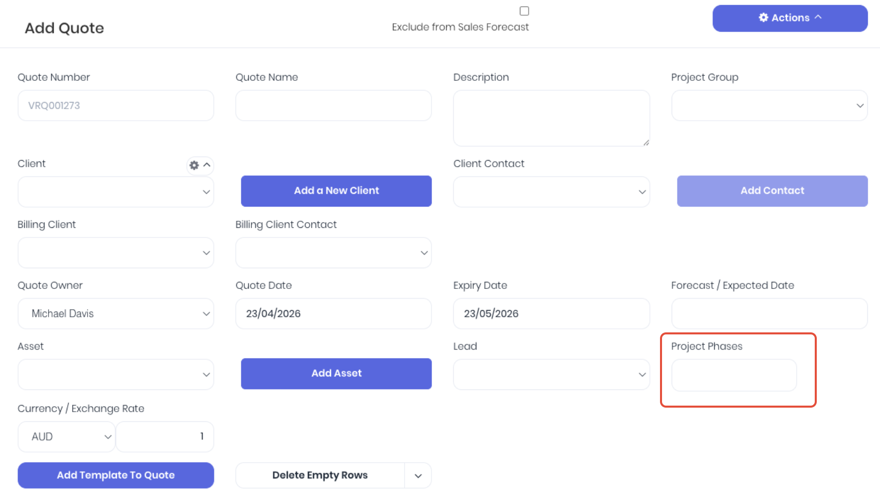 Phases are created directly on the quote details page when either creating or editing a quote. Note: Phases can also be pre-templated on your project templates so they are applied automatically with the quote template.