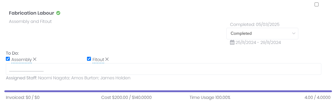 - Progress - Tasks are setup to track the labour costs in for the unit of work being conducted. Examples include Design, Fabrication and Installation. This workflow allows staff to add time to the actual task they are completing, and allows the task to be completed to provide the project with an accurate progress metric that is independent of time.