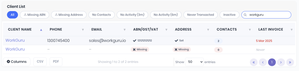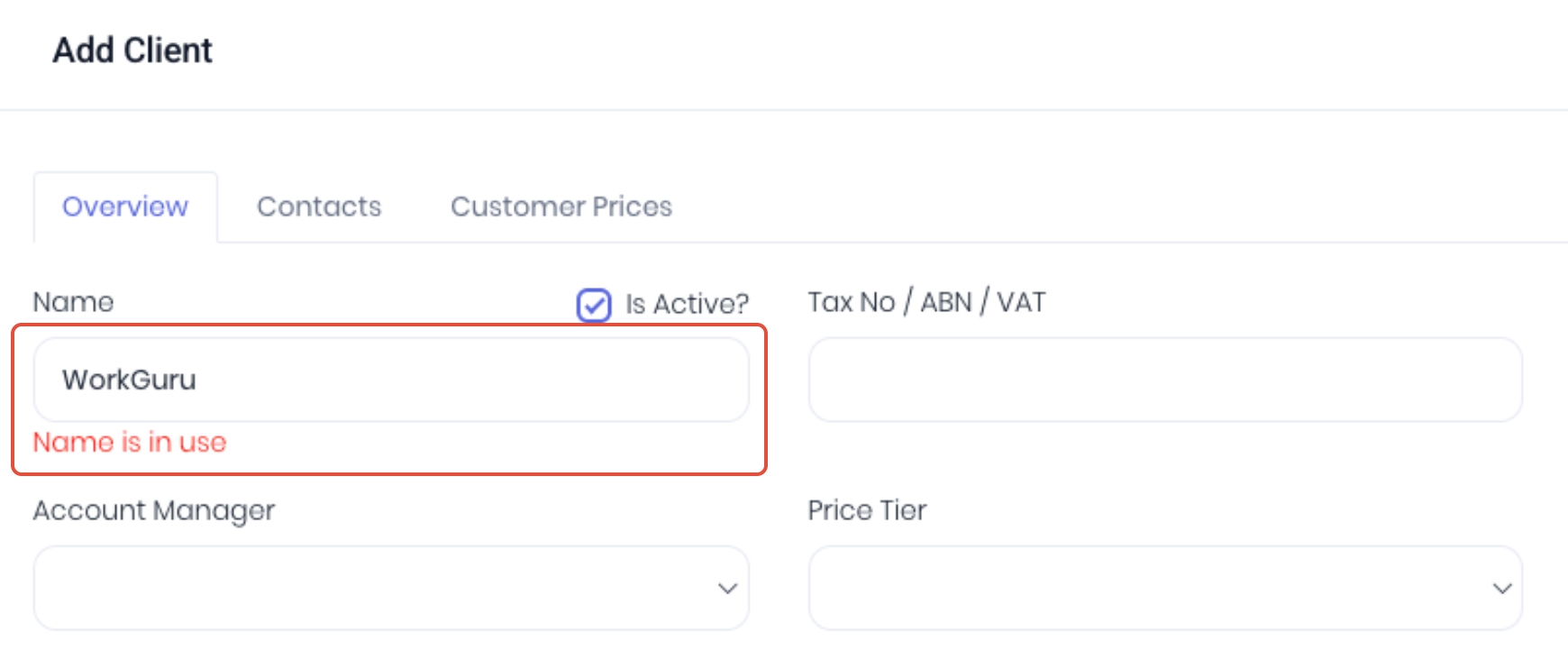 Note: When adding clients, WorkGuru will notify you that the client name is a duplicate. Importing clients will NOT prevent duplication.