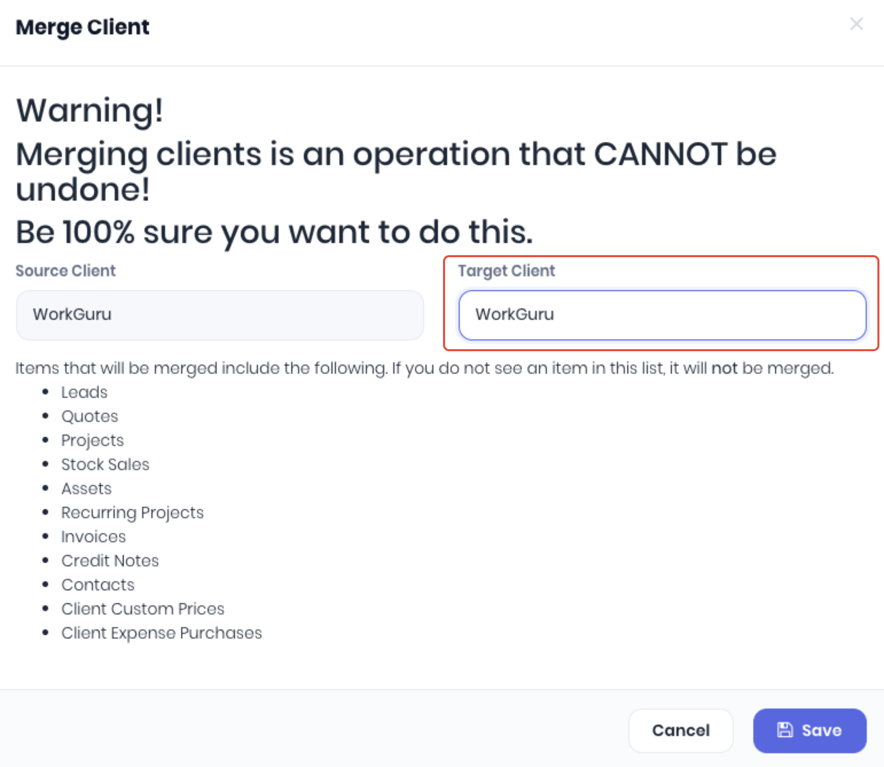 Review the Merge Client popup and select the Target Client you want to merge the duplicate into. Note: The Source Client will not appear in the Target Client list.