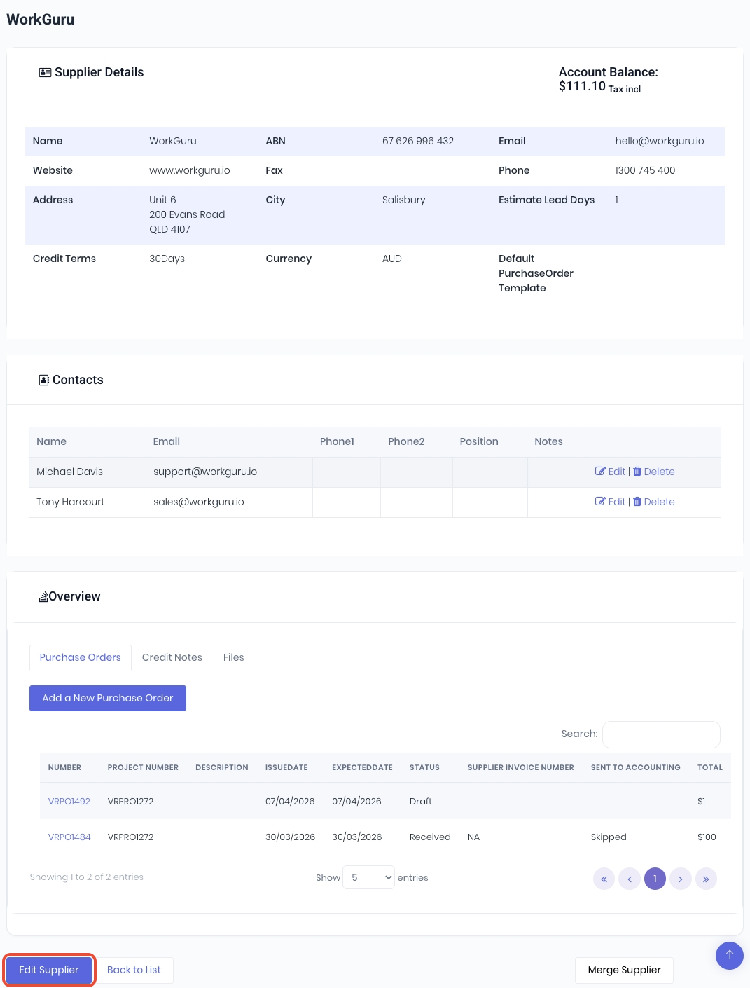 Add a contact to an existing supplier by clicking Edit Supplier from the required supplier's detail page.