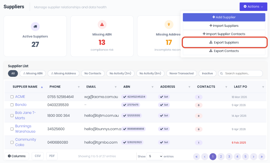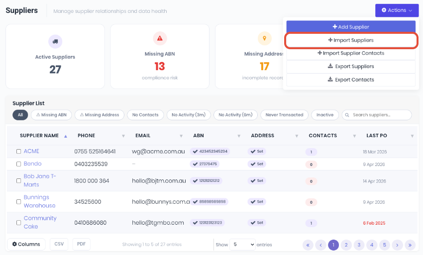 When updating suppliers in bulk, the import is matched on the supplier name. You can either use a new import of new or updated supplier details, or another option is to export your existing supplier list to a spreadsheet to update details before importing. You can update your current supplier list by selecting Export Suppliers from the Actions menu on the supplier dashboard, making any changes and then importing: