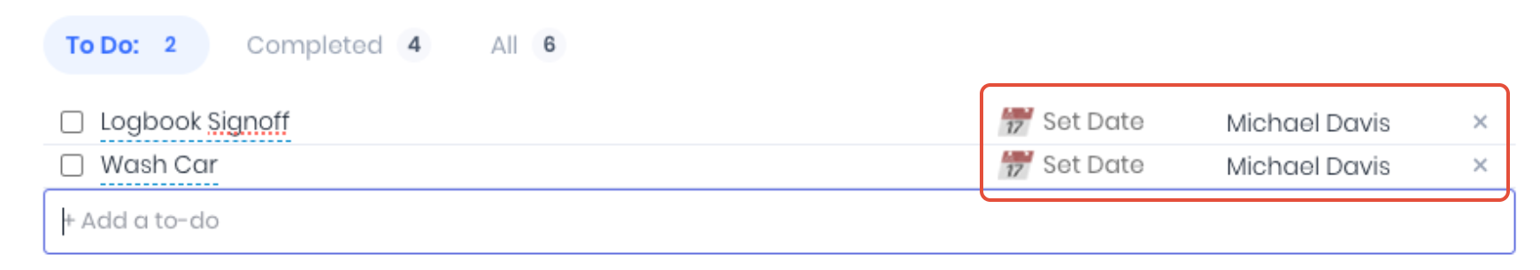 Once a to-do has been added, you can schedule the to-do by clicking Set Date and selecting the required date from the calendar pop-up. Assign the to-do to another user by clicking on the User and selecting the user from the dropdown.