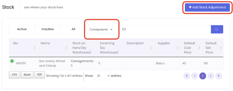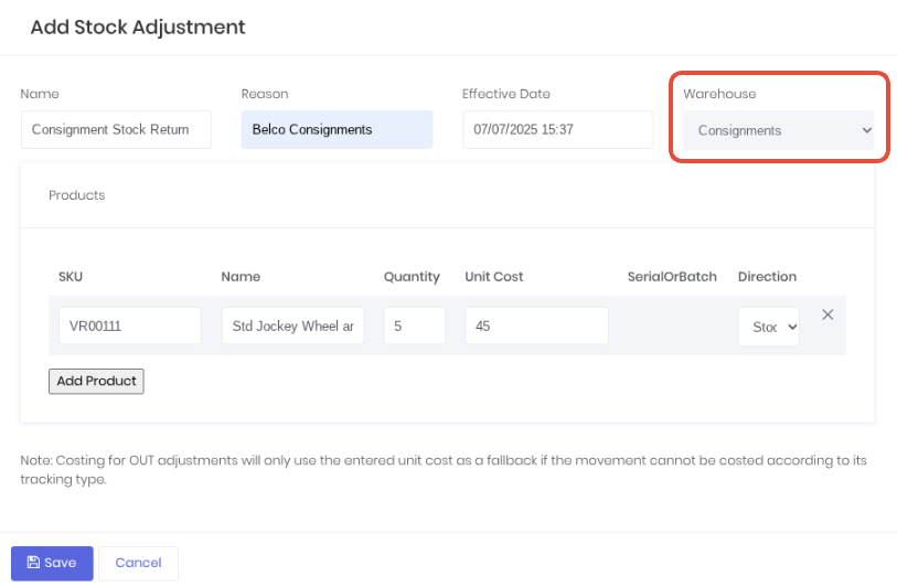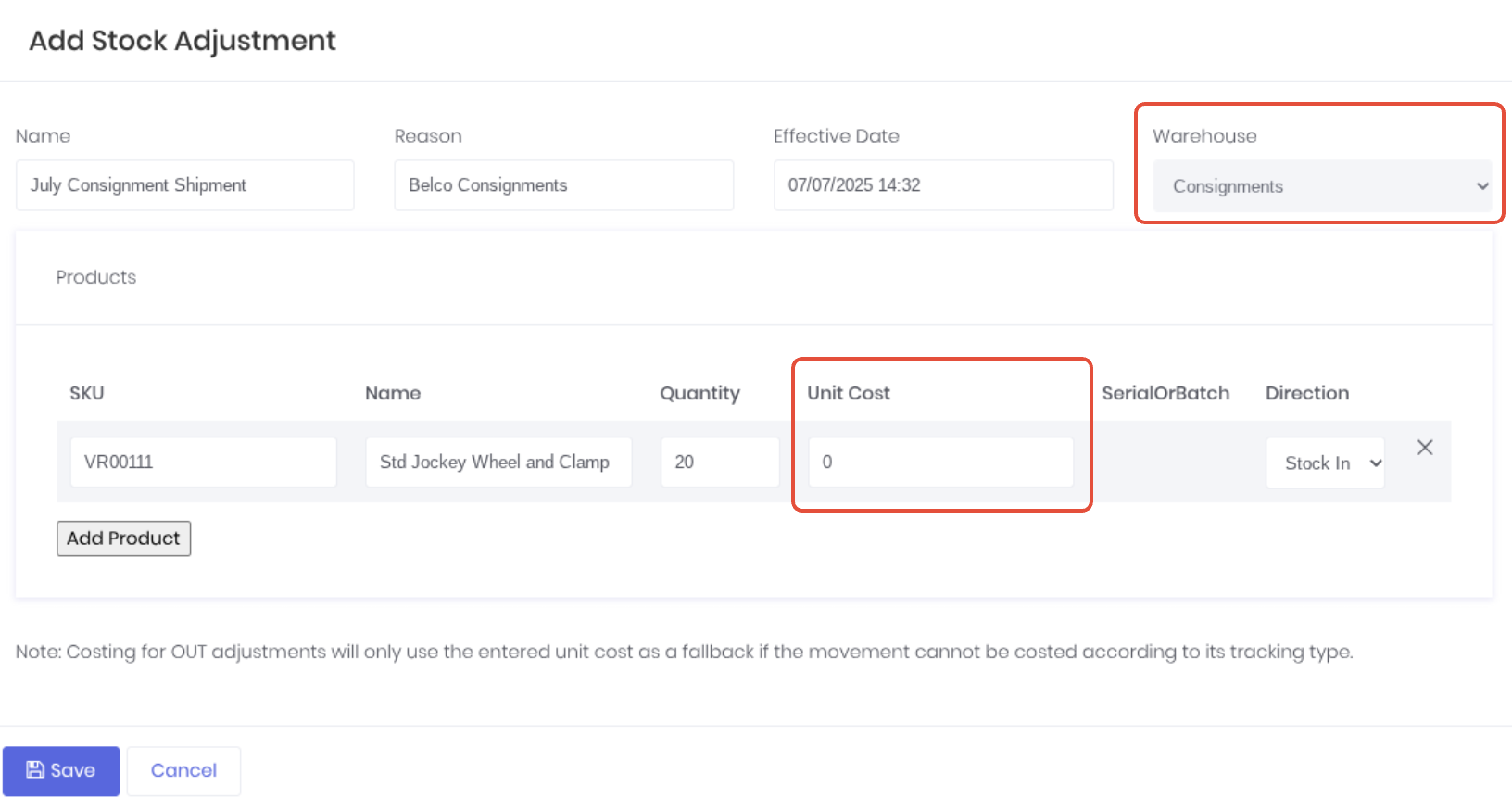 Receive consignment stock sent from the supplier via a stock adjustment. Adjust the received consignment stock INTO the consignment warehouse, ensuring the unit cost is ZERO ($0) dollars. This is an important step as the consignor still owns the value of the stock, so we do not want to increase your stock on hand value.
