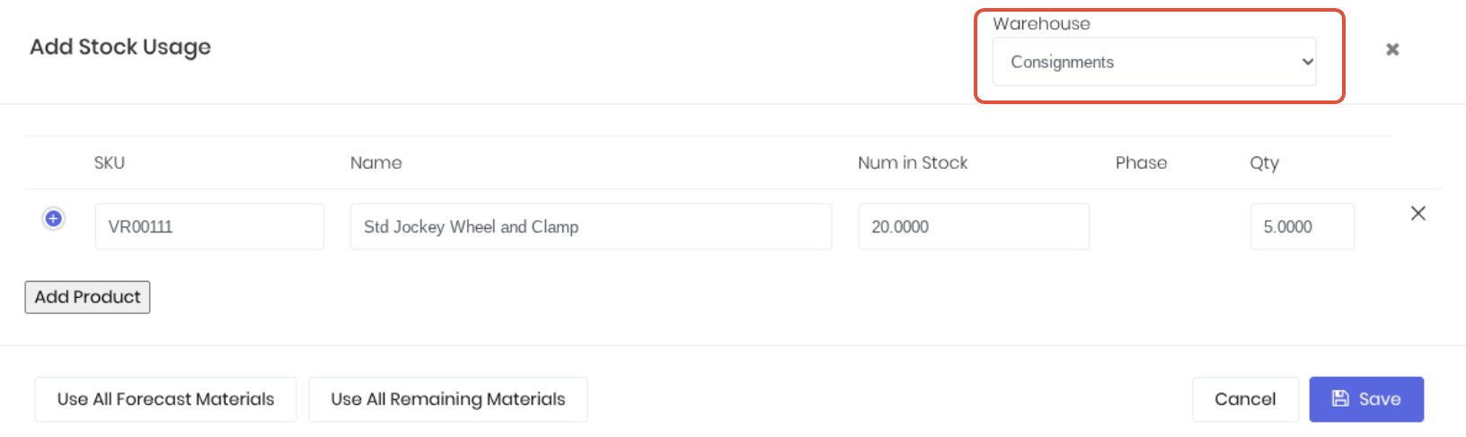 Use your consignment stock on the project as normal via the Quick Action menu's Use Materials button. Ensure the consignment Warehouse is selected before adding the usage to display the current consignment availability.