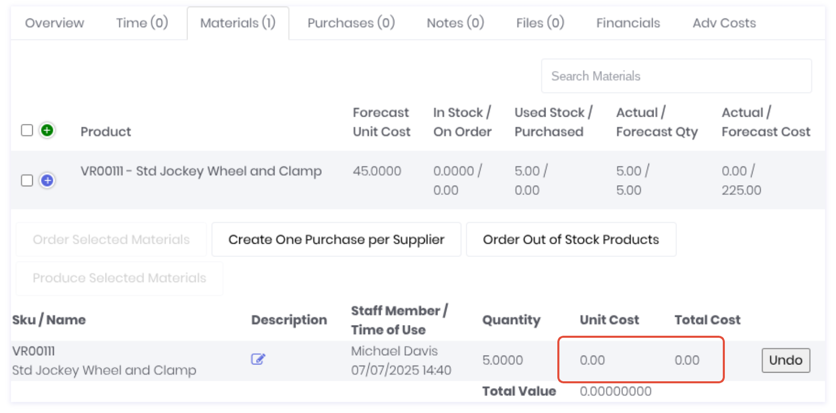 Depending on your consignment agreements, raise a project or advanced purchase order to send to the consignor supplier to notify them we have used consignment stock and are expecting an invoice. This will then track the correct cost and profitability on the project once invoiced.