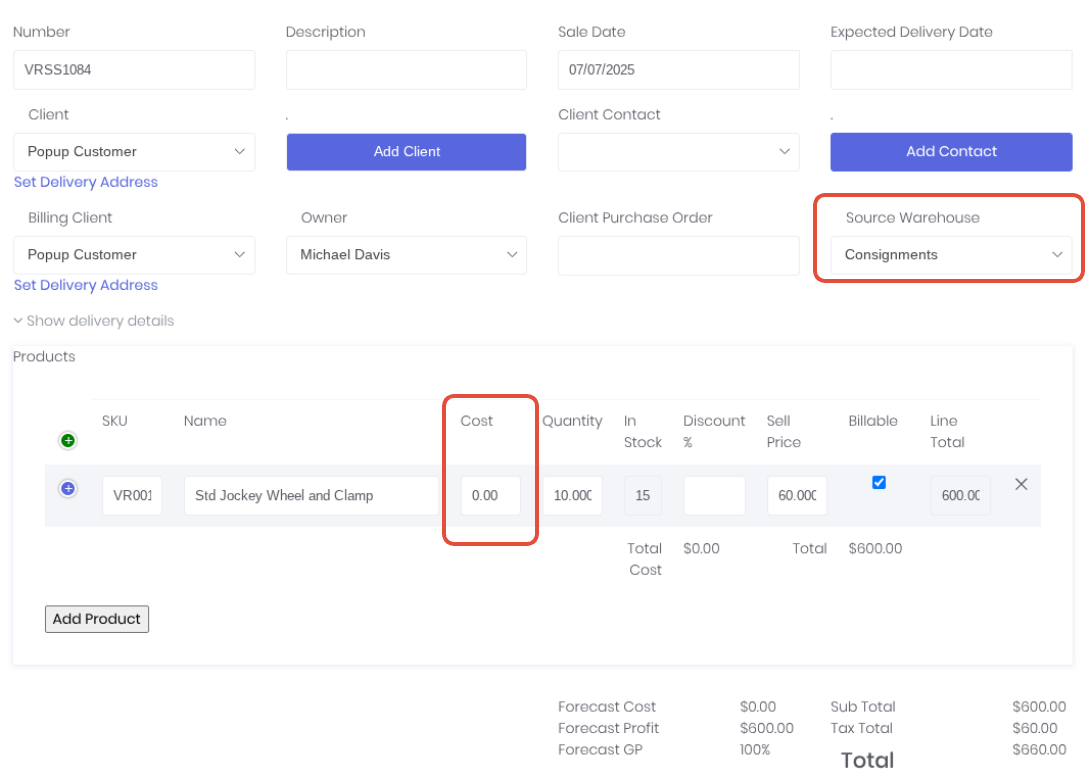 Complete or dispatch the Stock Sale as required. The consignment stock will be dispatched correctly at $0 (remember you don't pay for it until it is used).