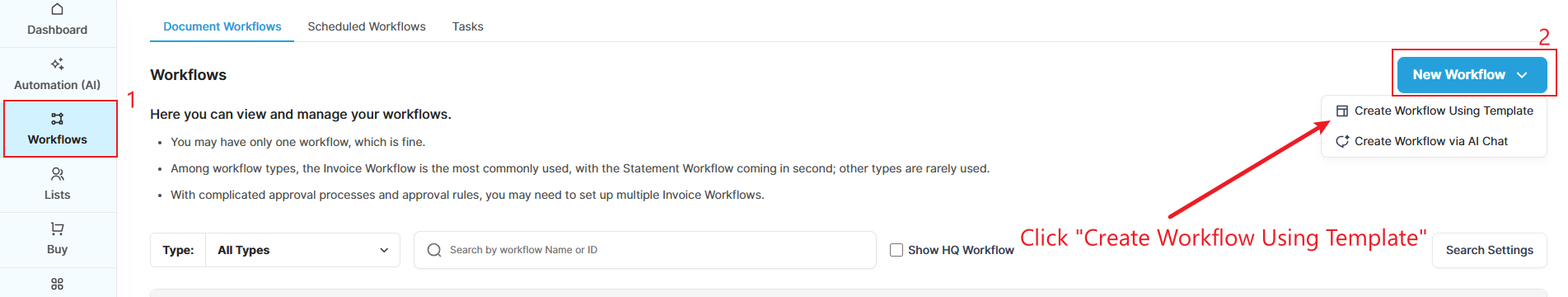 then click the New Workflow(2) dropdown at the top right, and select Create Workflow Using Template(3).