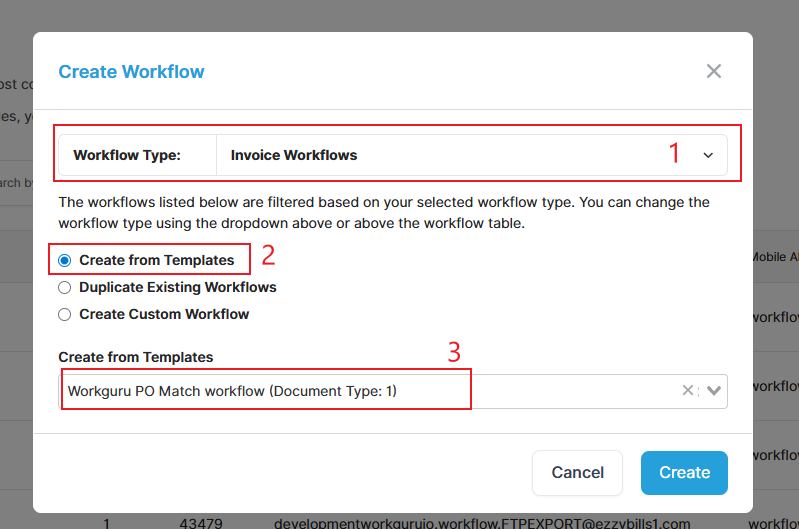 On the workflow creation pop up window, select Invoice Workflows(1) in Workflow Type dropdown and select Create from Templates(2), an extra drop down will show up, then select Workguru PO Match workflow (Document Type: 1) (3), then hit Create as final step, it will automatically create the workflow for you!