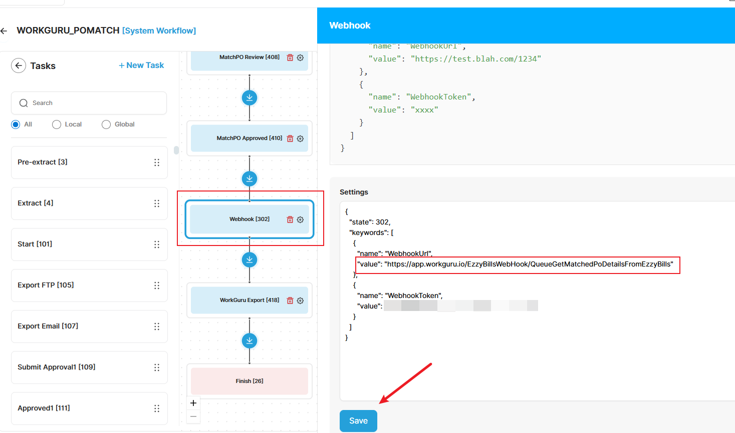 Find the Webhook task from generated workflow, click on the settings cog and replace the webhook url value by https://uk.workguru.io/EzzyBillsWebHook/QueueGetMatchedPoDetailsFromEzzyBills.