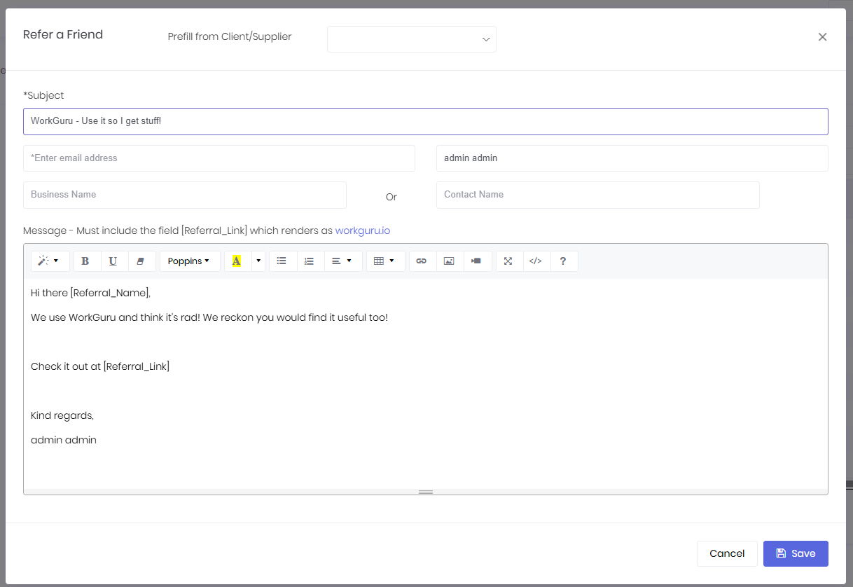 Using the Refer a Friend feature, you can send a referral to WorkGuru by email. To access the referral section, follow this link;