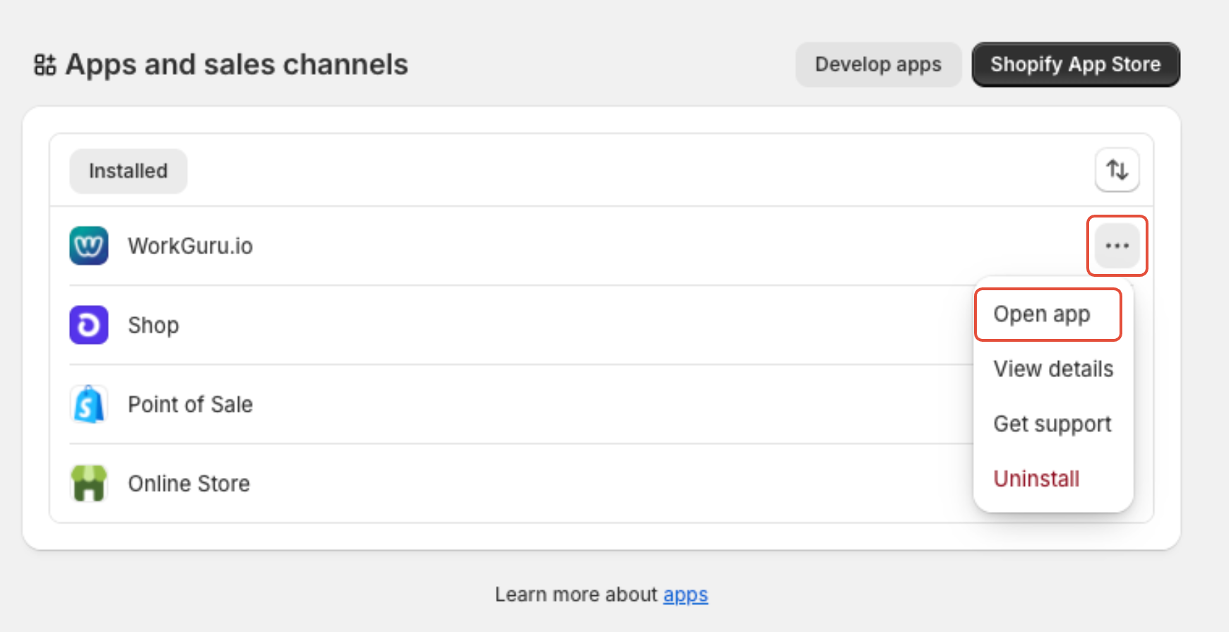 from the WorkGuru app in the Apps and sales channels page.