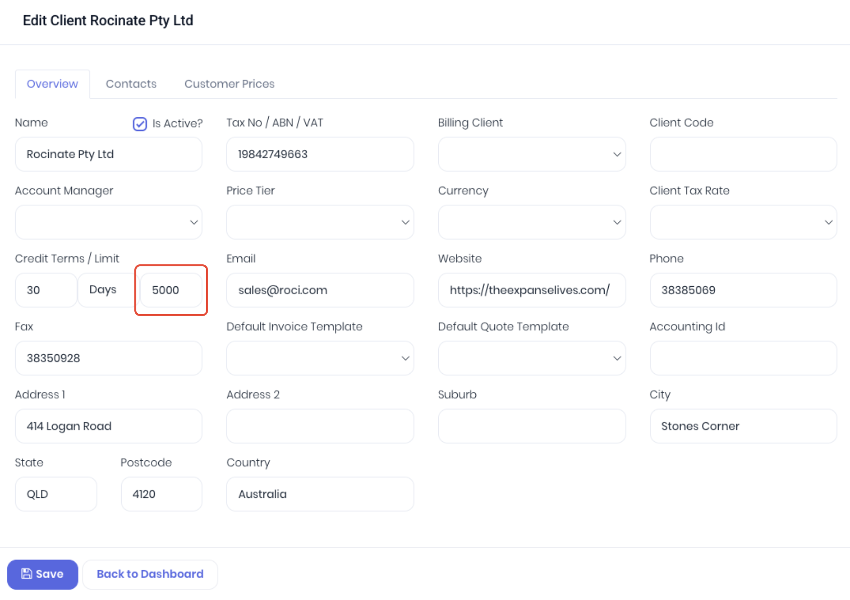 From the client details page, edit the client and enter the required limit under the Credit Terms / Limit field: