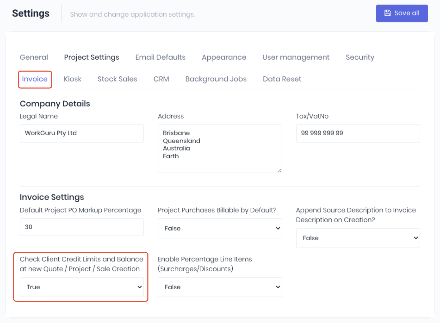 To enable credit limits, first ensure that the checks are enabled in your invoice settings (Administration -> Settings -> Invoice). Set the Check Client Credit Limits and Balance at new Quote / Project / Sale Creation dropdown to True