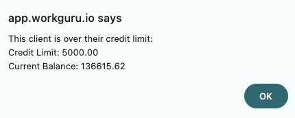Client credit limits allow you WorkGuru users to be notified if a client's current account balance is currently over the nominated limit when the following transaction are created:
