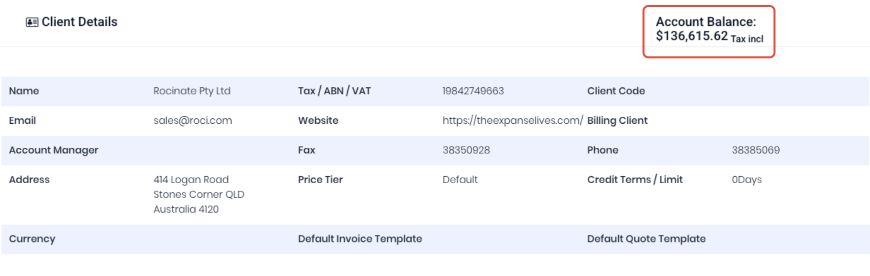 Note: The account balance in WorkGuru is based only on invoices and payments raised and applied in WorkGuru. It may not match the client's true account balance, which is managed in the connect accounting integration.