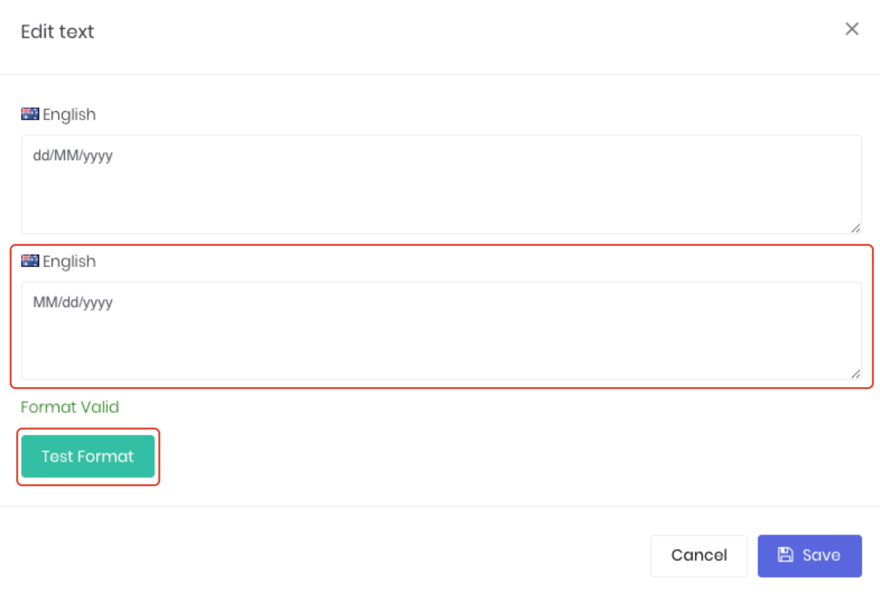 Update the second text section to display the required format, such as MM/dd/yyyy to display the US month/day/year format. Click Test Format to confirm the edits are compatible with WorkGuru. Note: Do not save a date format that does not display Format Valid after testing.
