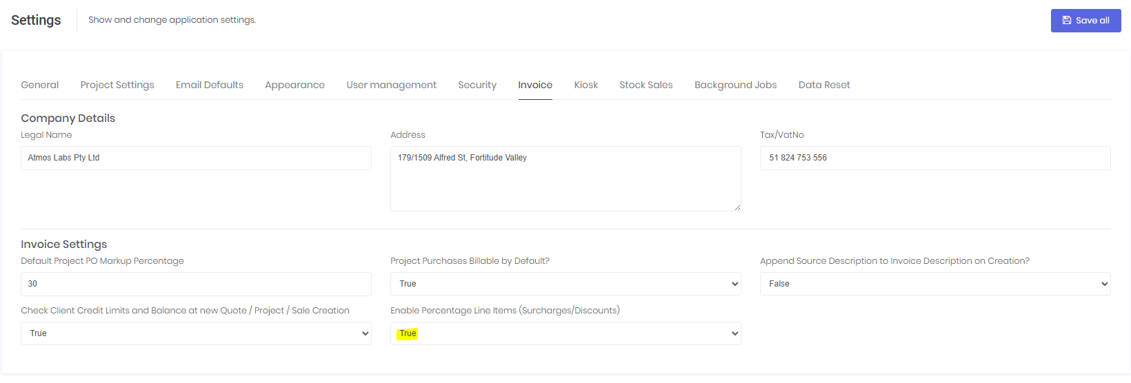 - In the Invoice Settings section, locate the Enable Percentage Line Items (Surcharges/Discount) dropdown.