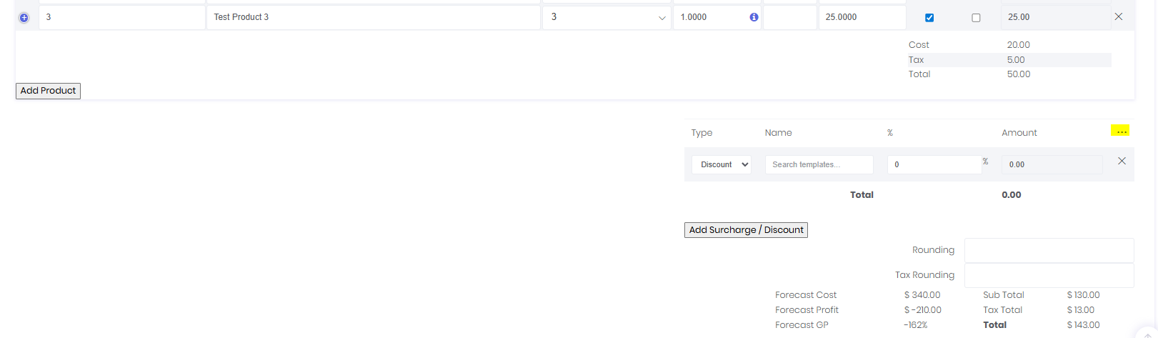 On the Invoice edit page, scroll below the product, task, and purchase line item tables. Click the Add Surcharge / Discount button to add a new row.