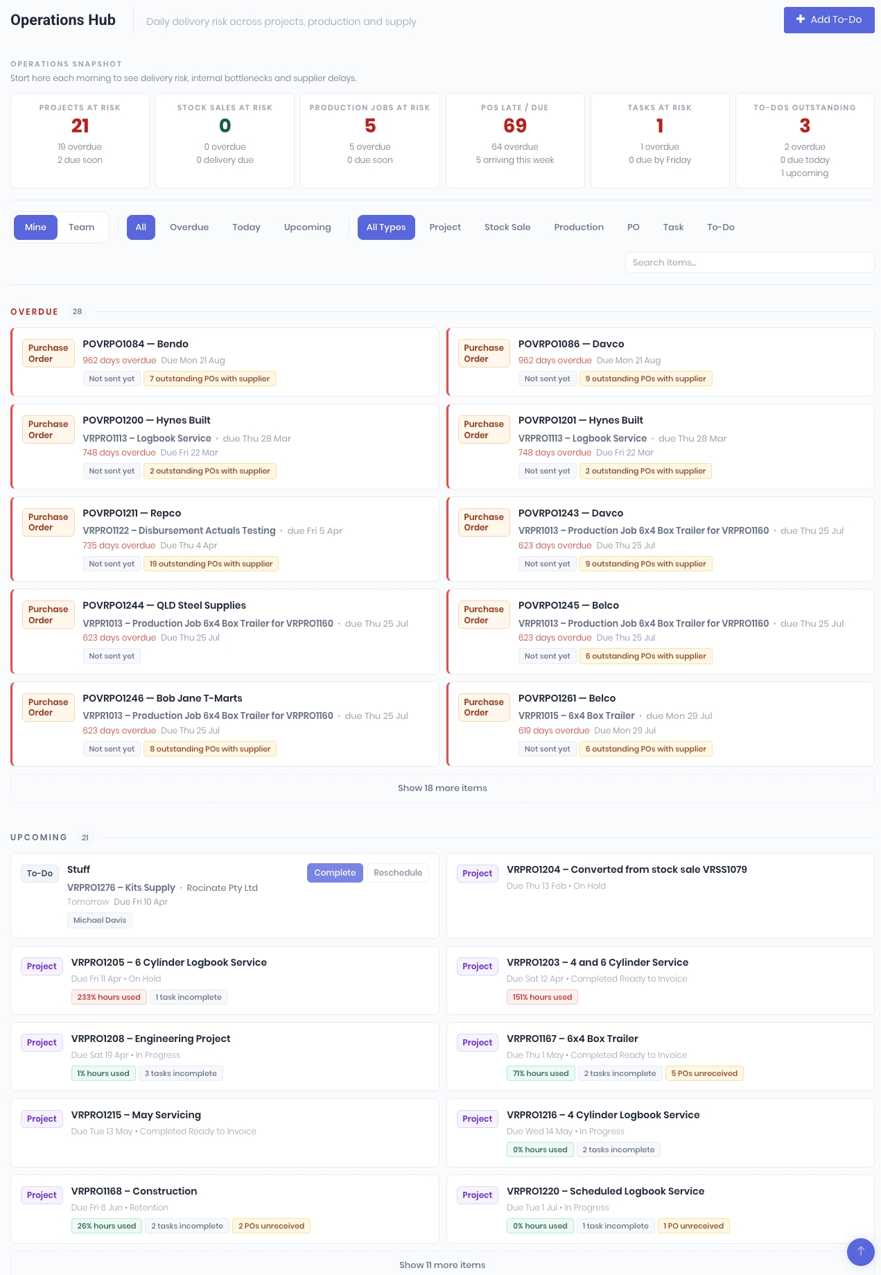The Operations Hub is about delivering your workflow. It pulls together projects, production jobs, purchase orders, tasks, stock sales, and to-dos into a single operational dashboard - so you can see what's at risk before it becomes a problem.